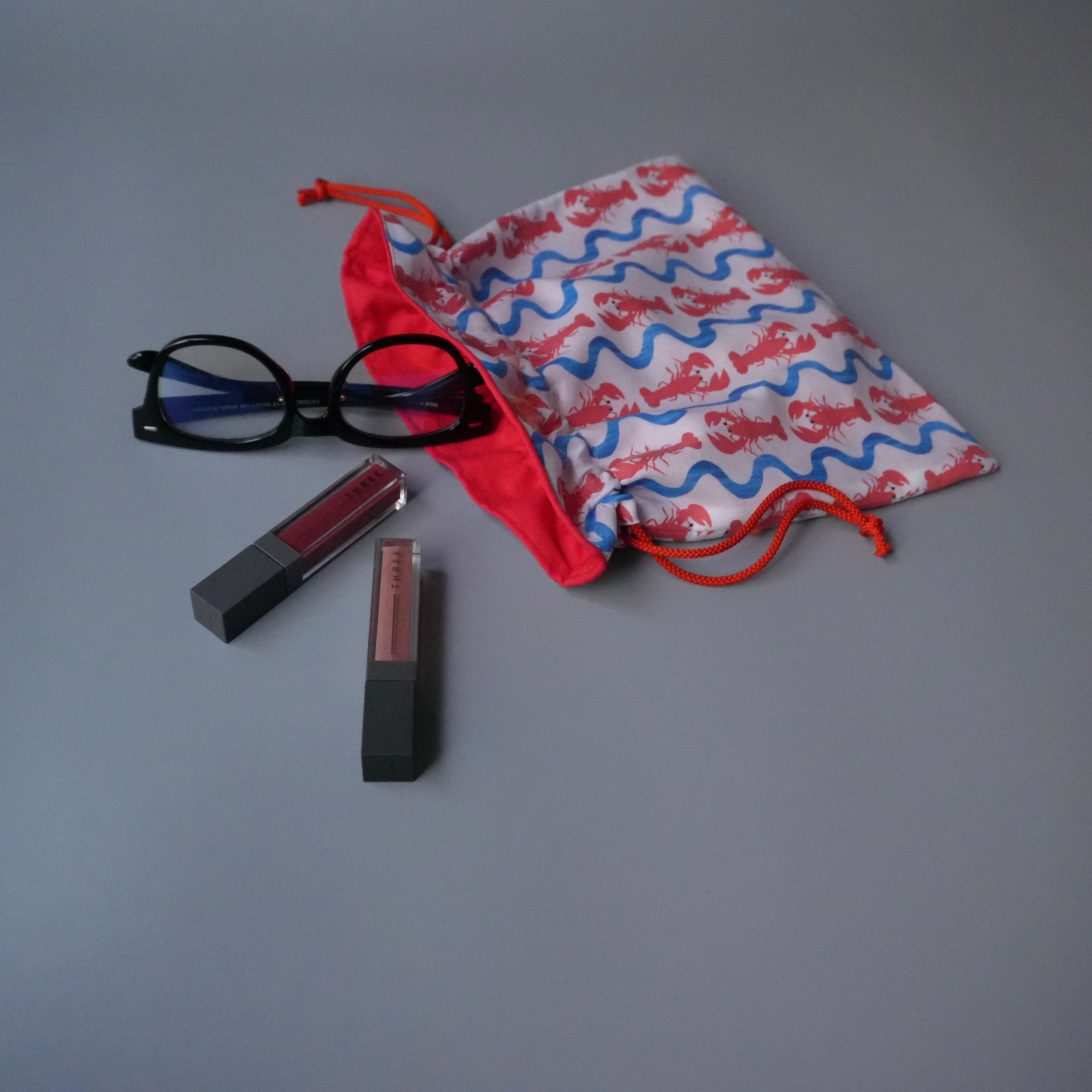 ロブスターと波を組み合わせたポップなカラーが印象的なテキスタイルデザイン。裏地のレッドと紐のビビッドなオレンジで持つだけで元気が出るような大人の遊び心満載な巾着
