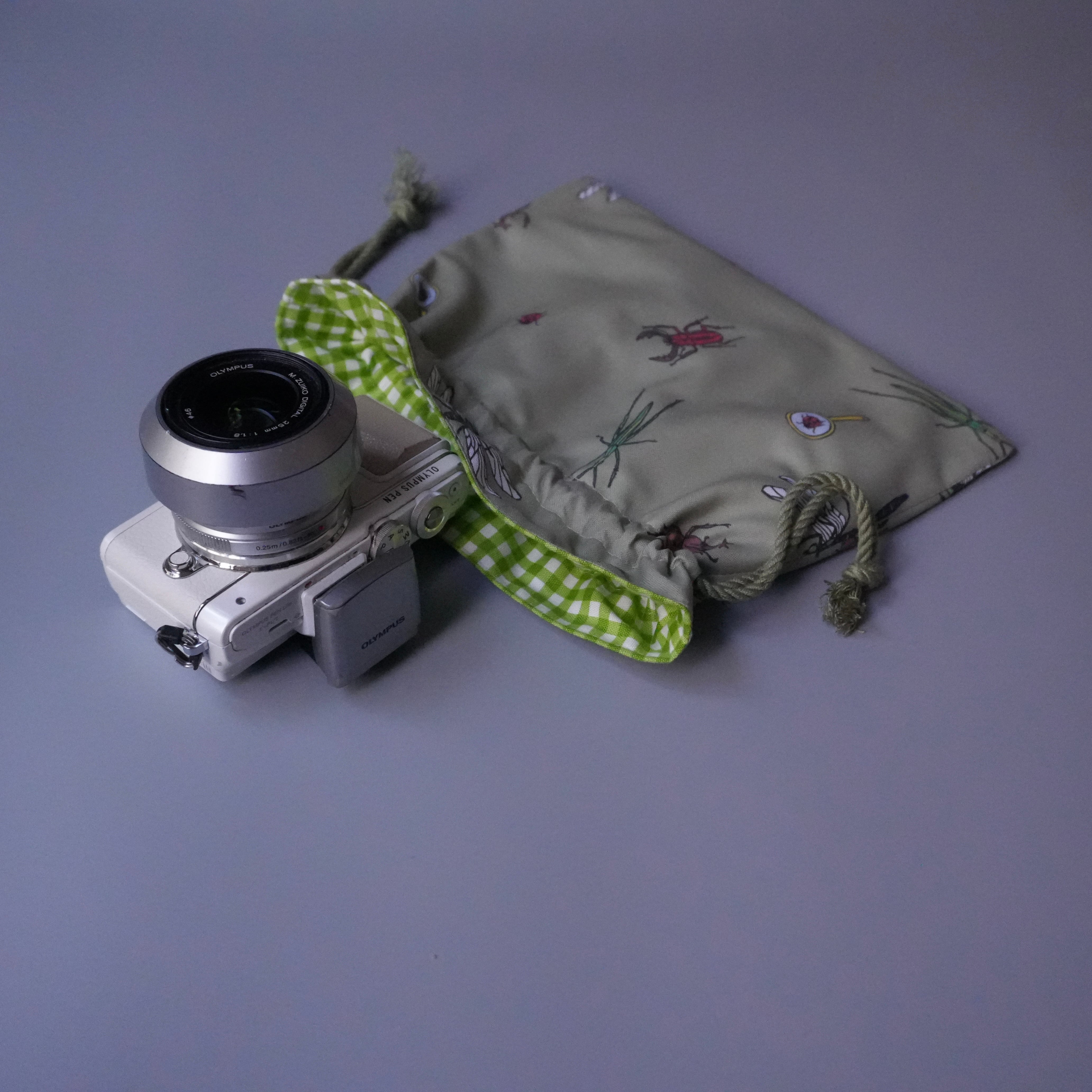 カブトムシにクワガタ、トンボ、バッタにテントウムシ、虫眼鏡で覗いたキュートなデザインが印象的。裏地や紐はナチュラルなグリーンでまとめました。
